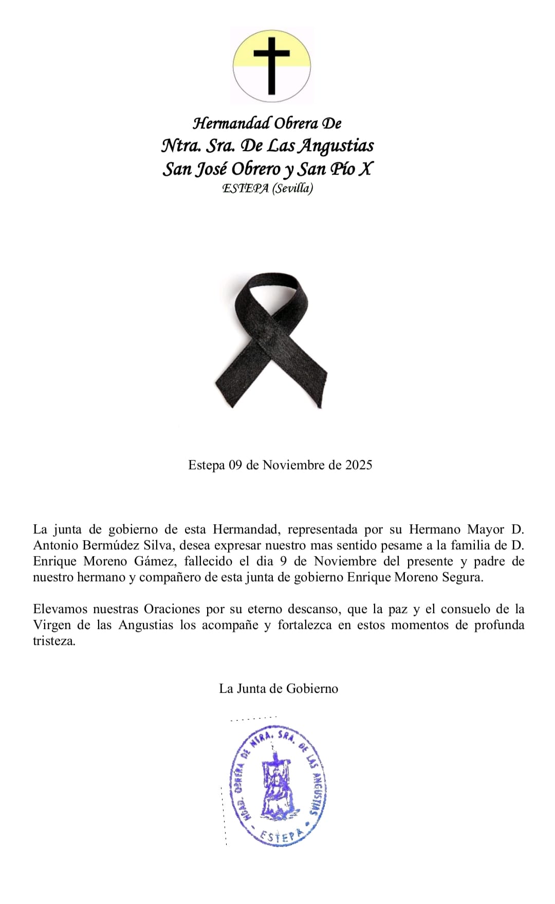 Comunicado de condolencias. Comunicado de Condolencias La Junta de Gobierno de la Hermandad de Ntra. Sra. de las Angustias, San José Obrero y San Pio X, desea expresar su más sentido pésame por el fallecimiento de D. Enrique Moreno Gámez, padre de nuestro hermano D. Enrique Moreno Segura. Nos unimos en oración al dolor de su familia y seres queridos, pidiendo a Nuestra Señora de las Angustias que les concedan el consuelo y la esperanza cristiana en estos momentos de […]